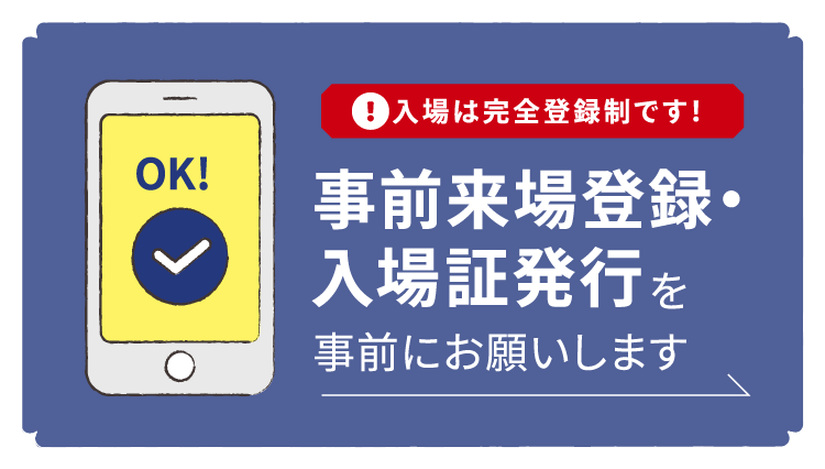 【お知らせ】本日4時頃より、以前に来場登録された方についてマイページに入れないエラーが発生しました。急ぎ、原因究明と復旧に努めております。ご利用の方には大変ご迷惑をおかけいたしますが、復旧まで今しばらくお待ちいただきますようよろしくお願い致します。