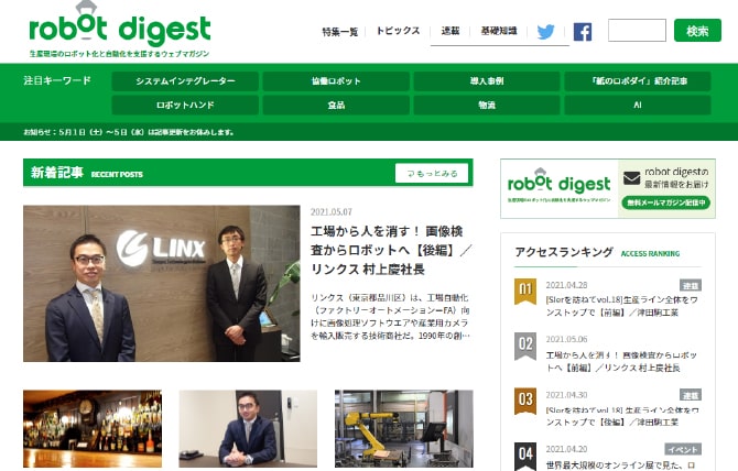 We collaborate with “robot digest”, a web magazine that supports robotization and automation of production sites. As an official media, it will set out many plans to boost the exhibition on the website. “robot digest” is one of the biggest media in Japan specializing in industrial robots with approx. 70,000 newsletter subscribers. It will extensively feature the voices of companies that decided to participate in the exhibition, highlights of the exhibition, information of new products, technology trends, etc. to boost the exhibition. In addition, it also plans to work with the official website during the exhibition to introduce what is happening in the venue in real time.