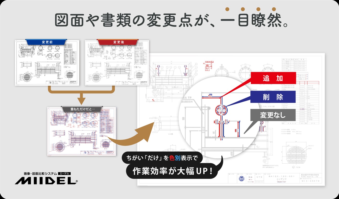 新旧の図面や書類を重ね合わせ、変更箇所を赤と青で瞬時に可視化する図面比較システムです。微細な差分も一瞬で判別し、ロボット設計時の検図ミス防止と業務効率化を実現します。