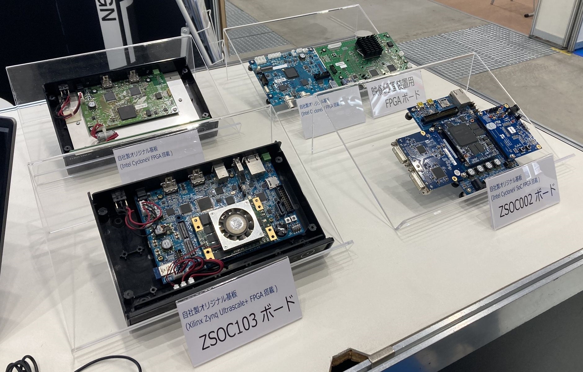 altera(旧Intel) / AMD(旧XILINX)FPGAを搭載した自社開発評価ボードを展示。