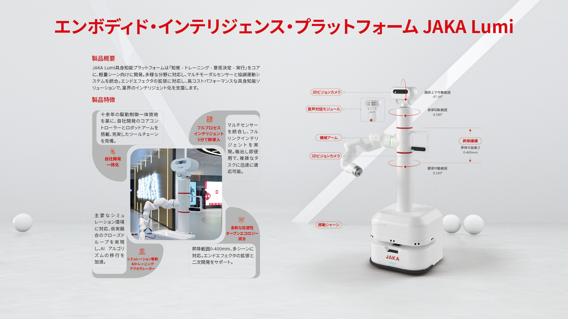 本展示では「柔軟な自動化」と「具身知能」をテーマに、JAKAは協働ロボットから汎用知能ロボットまでの先端技術とソリューションを紹介します。実演と体験を通じて、高精度・高安定性・導入のしやすさを体感いただき、産業・商業・教育分野の発展に貢献します。