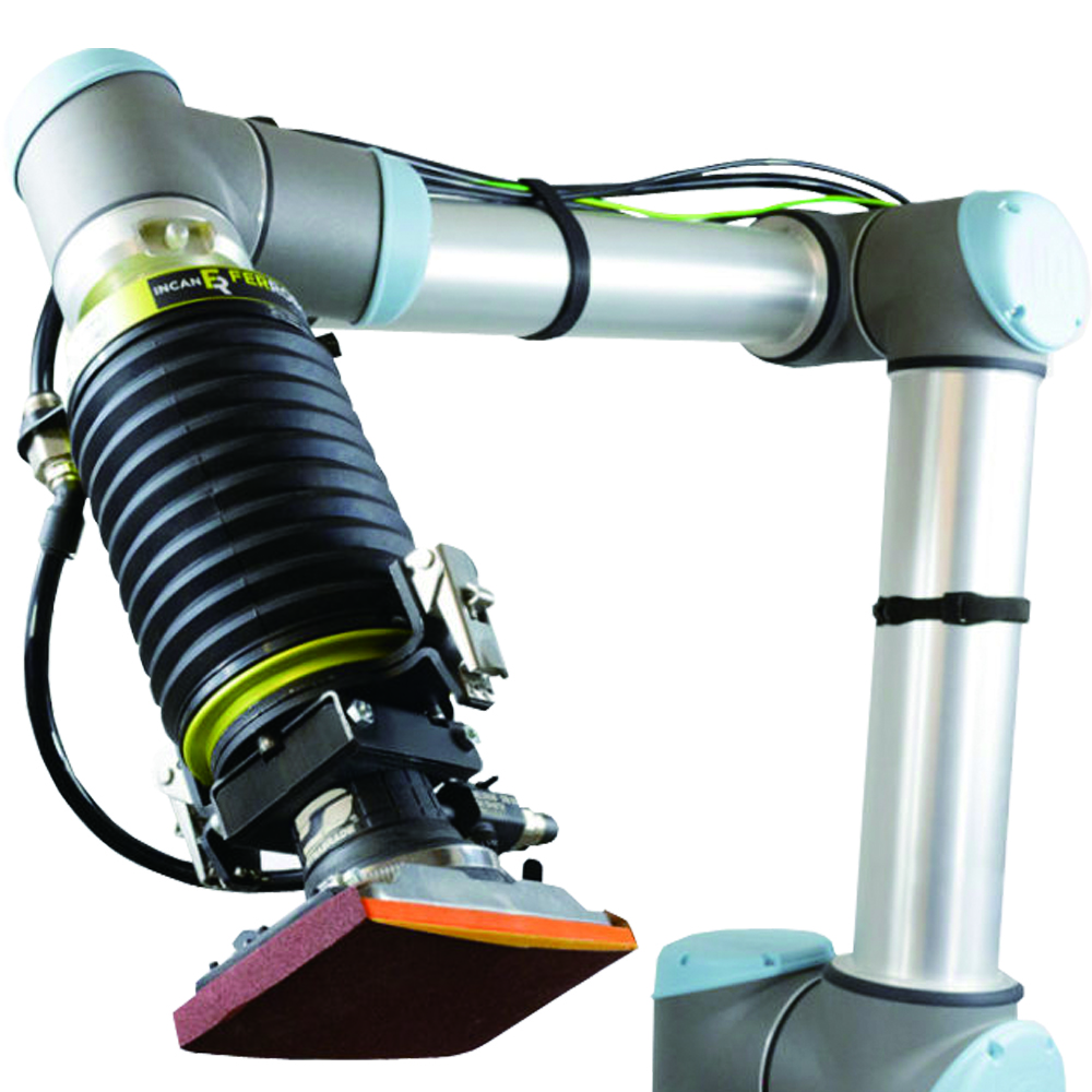 研磨ロボットは、オーストリア・FERROBOTICS社製のエンドエフェクタを採用。一定の押し付け圧を保持して研磨作業を自動化でき、波打つワークに対しても始点と終点の設定のみで簡単にティーチングができる。接触力の差を検知し、約4ミリ秒で高速追従可能。エンドエフェクタが軽量なため、可搬重量の小さい協働ロボットへの搭載も可能。