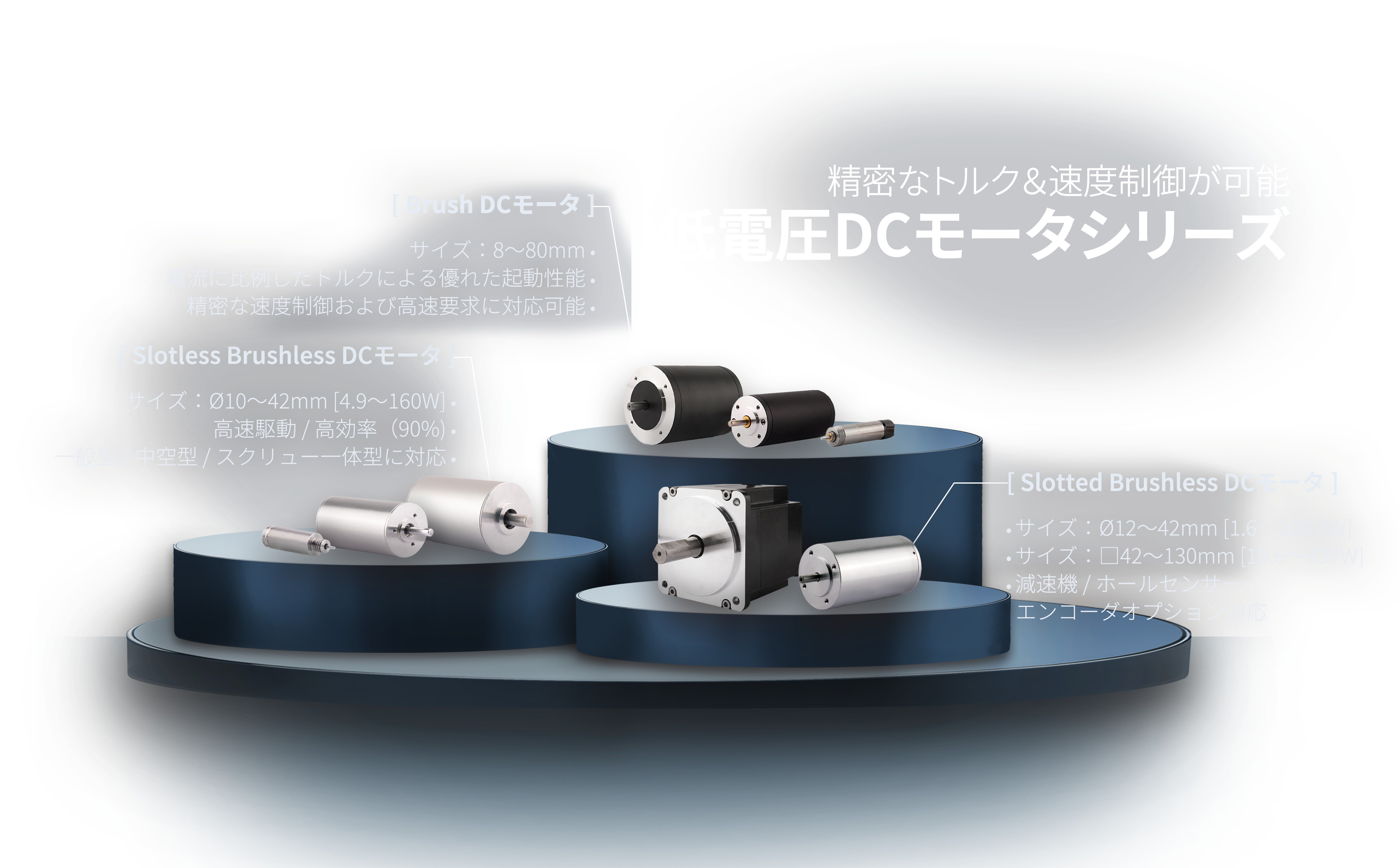 スロットレス構造でコギングレス。低ノイズ高効率に加え、高応答性で精密ロボット制御を支えます。減速機オプション対応可。