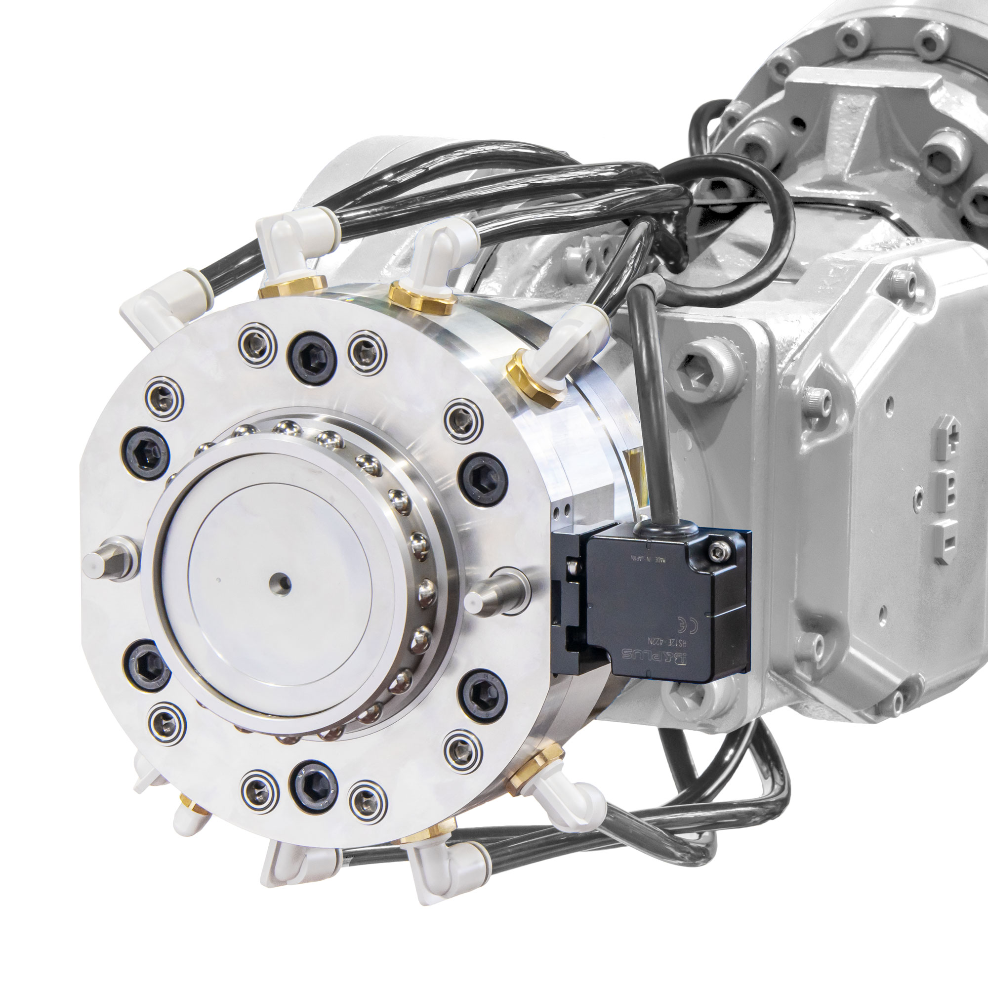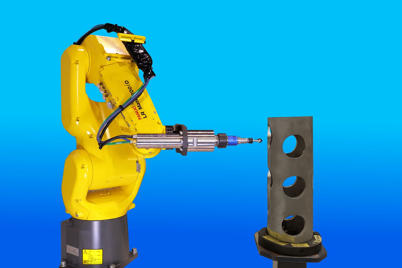 産業用ロボットに切削加工機能を持たせ、必要な周辺機器も完備。大型部品の切削加工や多品種少量生産に対応するために最適化された加工システム。