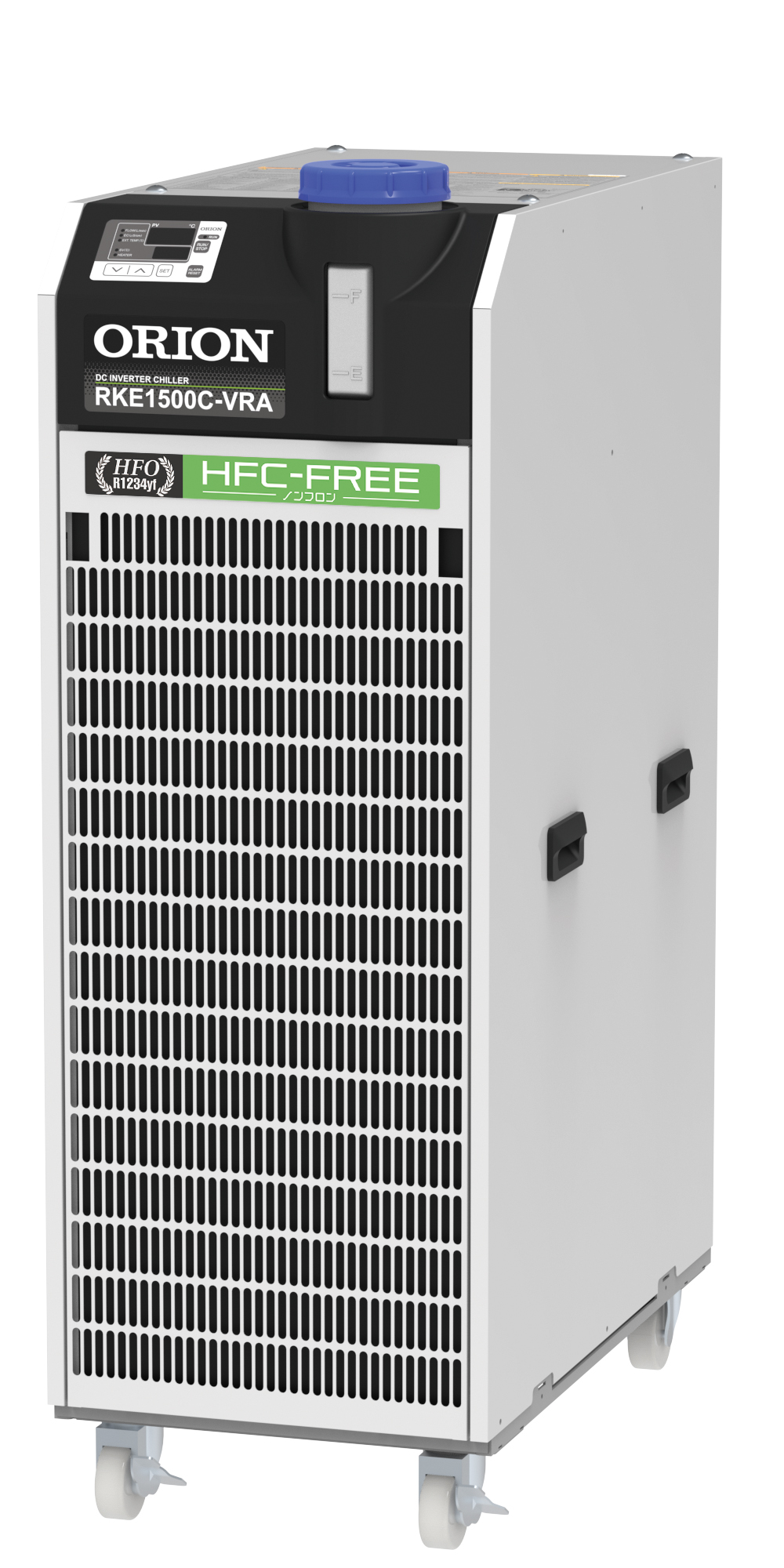 冷凍用圧縮機、ファン(空冷機)、ポンプそれぞれのモータ回転数をINVで最適制御。高精度・省エネを実現。冷媒R1234yf採用。