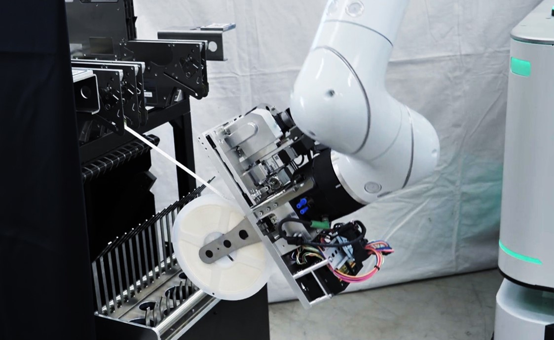 COBOTTA PROとAMRを組み合わせたモバイルマニピュレータを活用し、リール供給作業を自動化します。QRコード位置補正と制振機能で、サイクルタイム短縮を実現します。