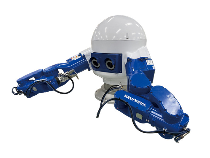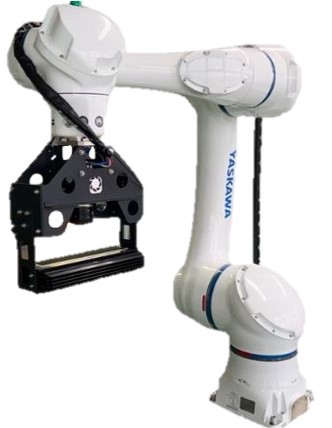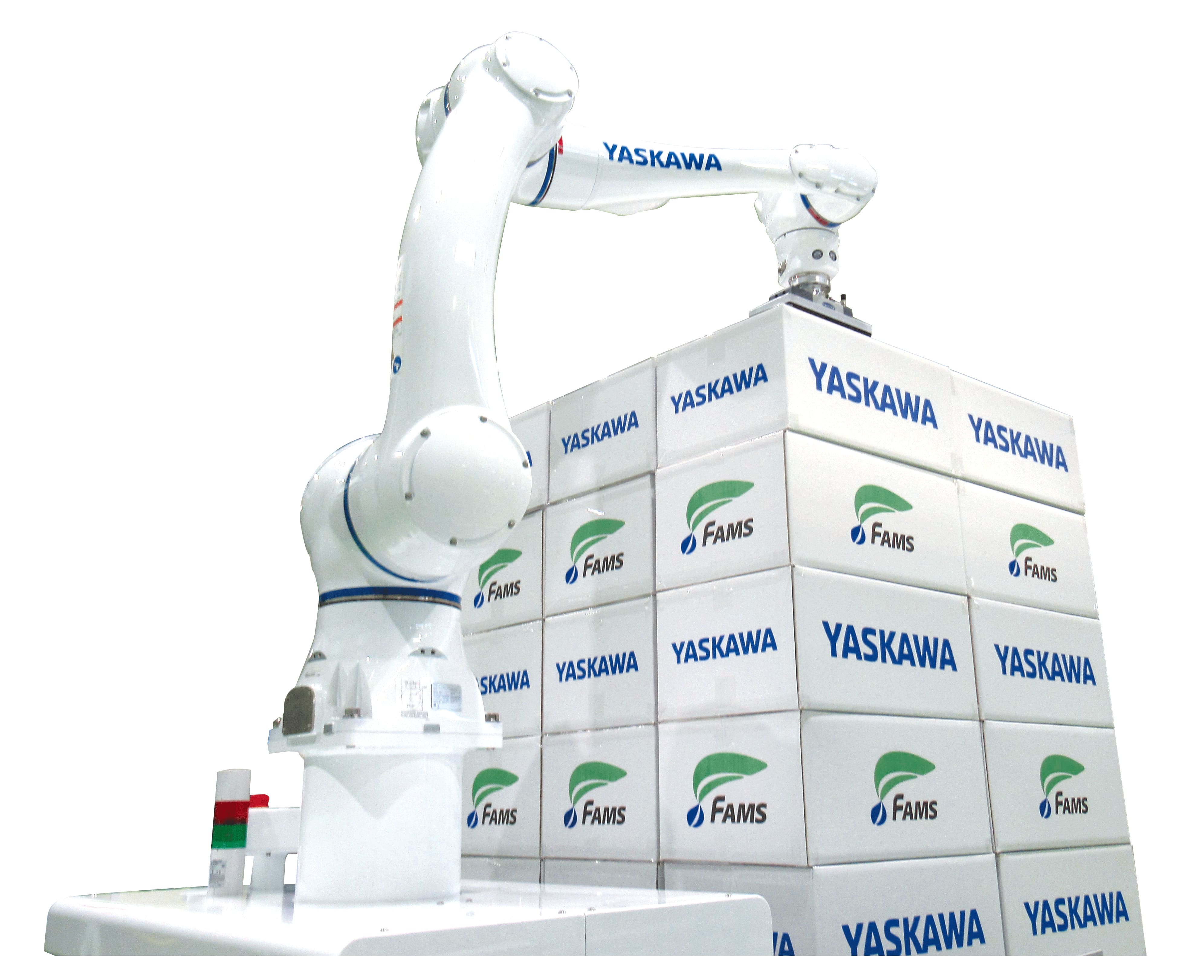 安川電機製人協働ロボットを使用したパレタイズのパッケージシステムです。段ボール箱だけでなくコンテナ、袋、一斗缶など様々なワークに対応しています。