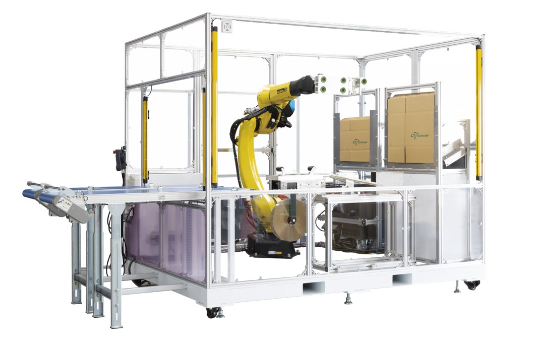 スターテクノは、多関節ロボットを活用したシステムインテグレーションを提供。段ボール製函から部品組付け、箱詰め、インケース、封函、パレタイズまでを一貫したラインとして展示し、工程全体の自動化を実現します。また、各工程単体でも最適なシステム提案が可能です。