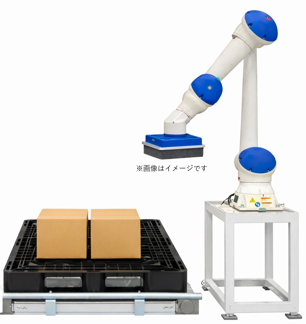 段ボール箱自動組立システムにより箱を組み立てた後、製品を箱詰めし、封函工程を経て、協働ロボットによるパレタイズを行います。製函からパレタイズまでの工程をご覧いただけます。