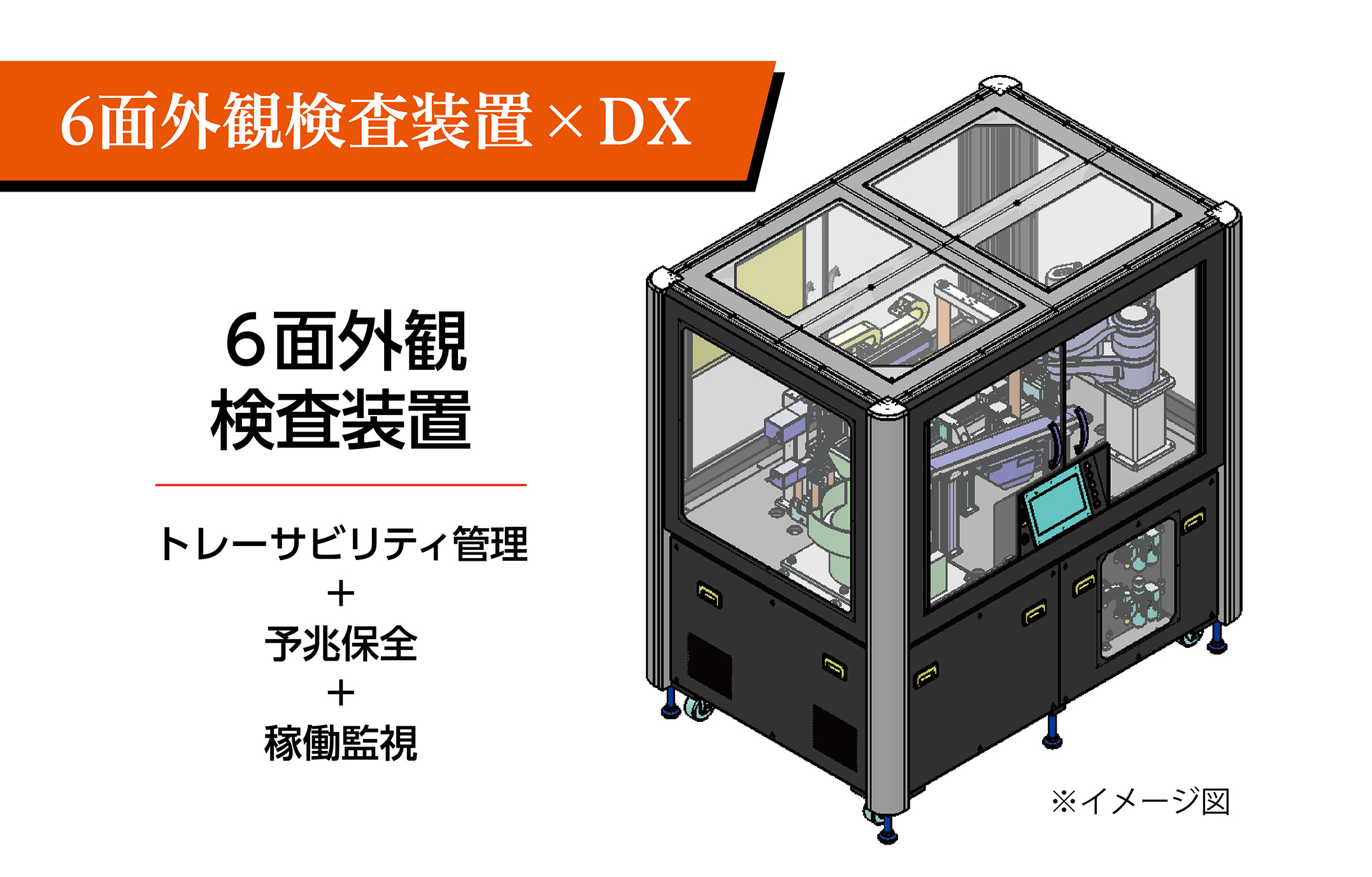 画像処理にて6面を検査し、OK/NGを振り分けて排出。画像処理とトレサビリティ、予兆保全まで一体化した高精度な検査システム。