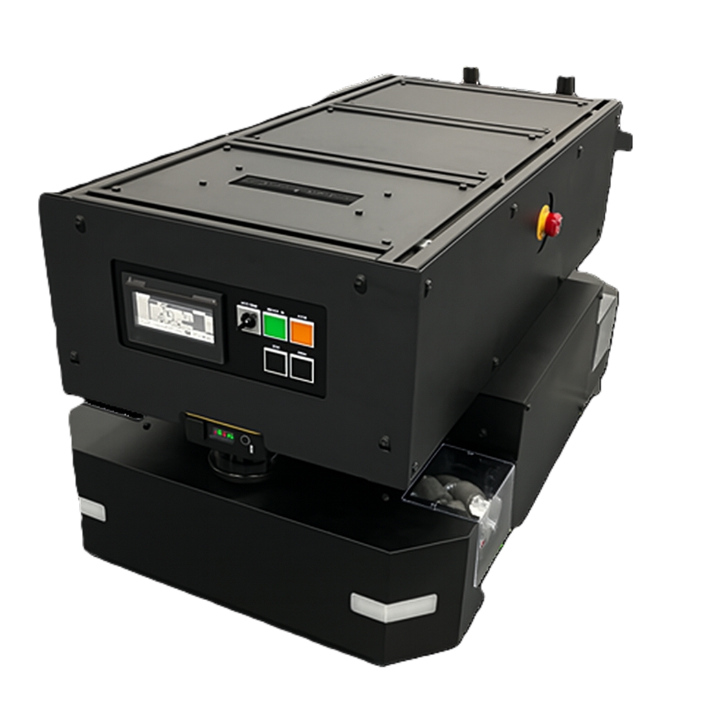 メカナムホイールによる全方位移動が可能なAMRで、本機のみでマッピング、ルート設定が可能です。PLCを内蔵しており外部装置とのやり取りや条件判断を現場感覚で設計できます。