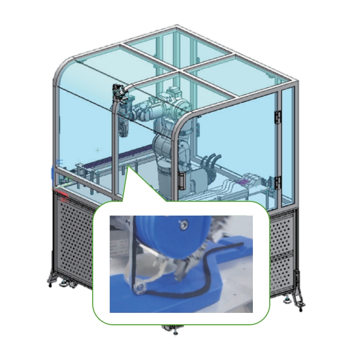 緩衝・消音・止水などに用いられるフォームテープの柔軟部品を、複雑形状なワークへ貼り付ける作業の自動化により、省人化に貢献します。