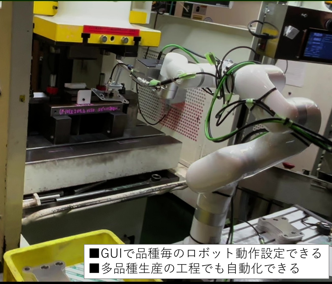 プレス機へのワーク投入出しを自動化。整列不要の通い箱供給に対応し、CAD不要で多品種運用を実現。
