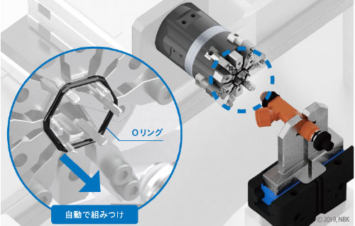 Oリングを広げて押しだす爪動作により、Oリングの自動組付けが可能です。