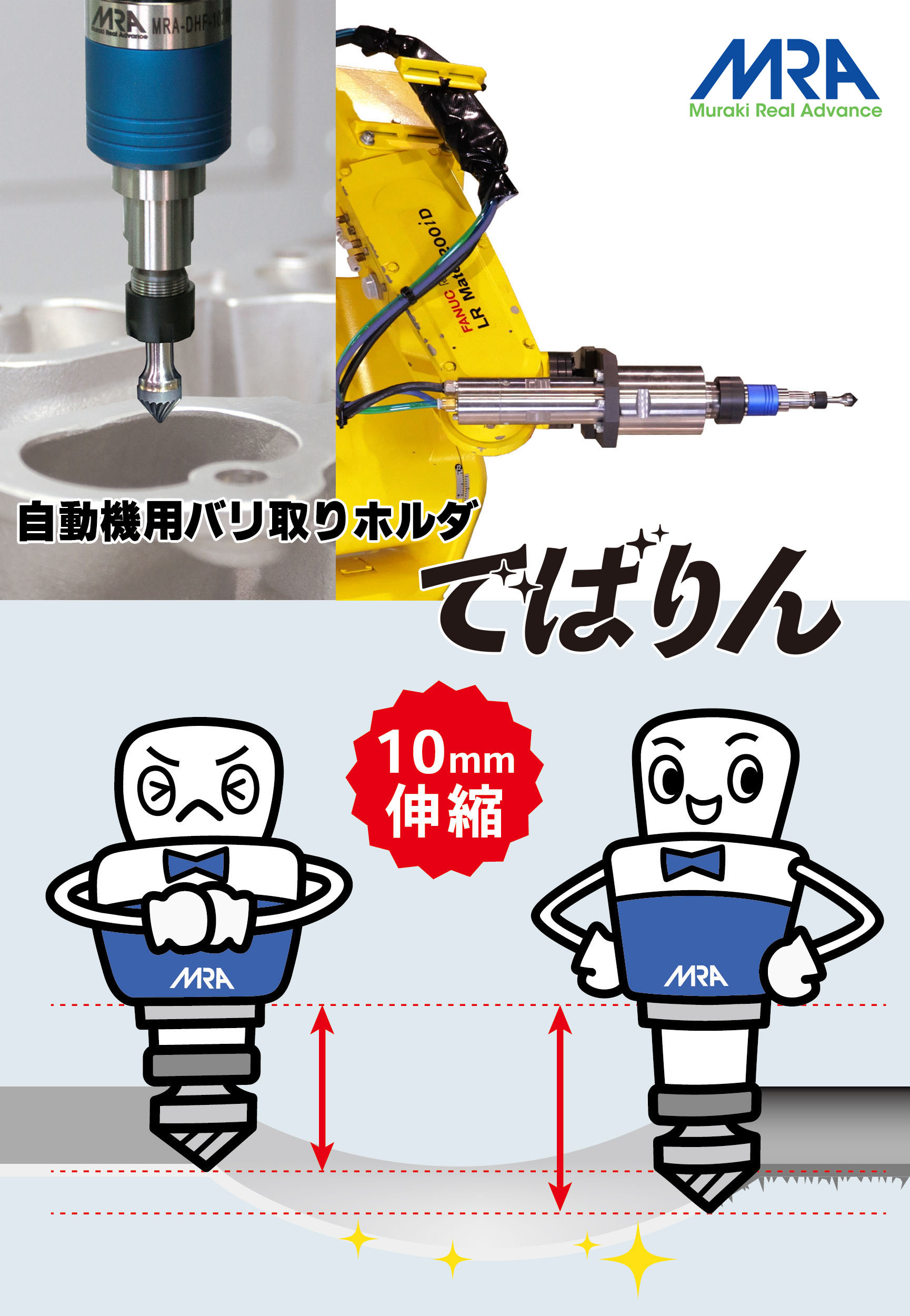 10㎜の伸縮機構を備え、ワークの形状に柔軟に対応するバリ取りホルダ。ロボットやマシニングセンタにおいて、ティーチング・プログラミングを簡略化できます!