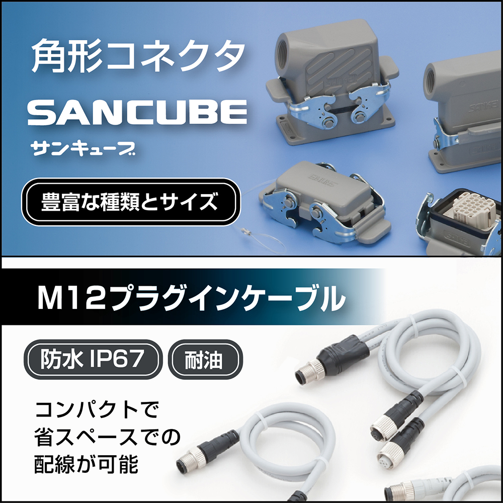その他、角形コネクタ「サンキューブ」、「M12プラグインケーブル」、(株)TERADA様と共同開発した「大電流コネクタ」や、「定番:ケイフレックス、ケイグランド、サンフレキROBO」を展示します。