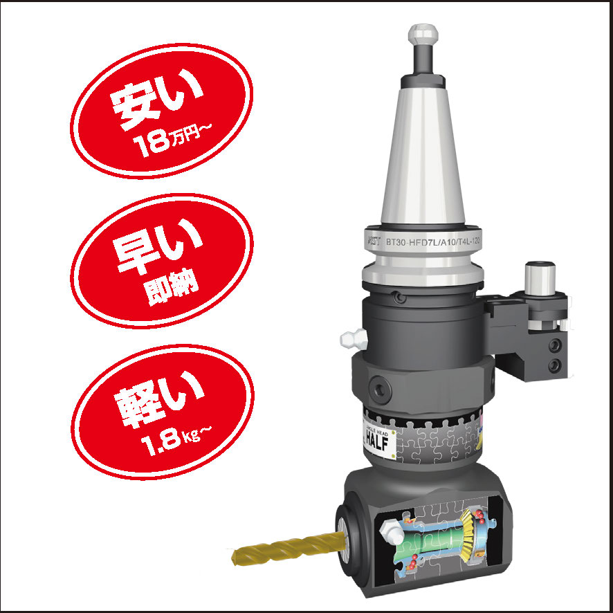 90°型・角度設定自在のユニバーサル型、極細ヘッドのmini型をラインナップしており、工程集約を実現する。BT30マシニングセンタにも対応。