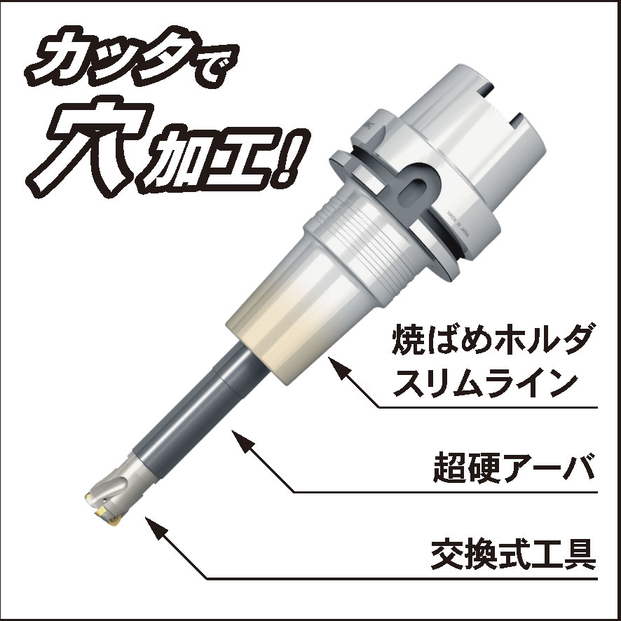「ミルボア」は焼ばめホルダ スリムラインと超硬アーバを組み合わせた、交換式工具用ホルダです。ワークの形状に合わせてホルダと超硬アーバの組合せが自由に行える。