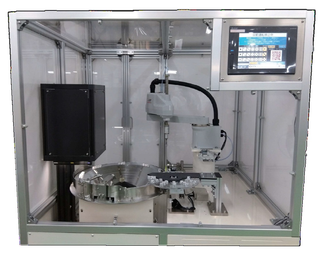パーツフィーダで整列供給が難しい物を、ビジョンシステムを使用してピッキングする装置。専用機ではメリットが少ない小ロット生産の物でも、兼用で対応が可能な汎用性が高い。