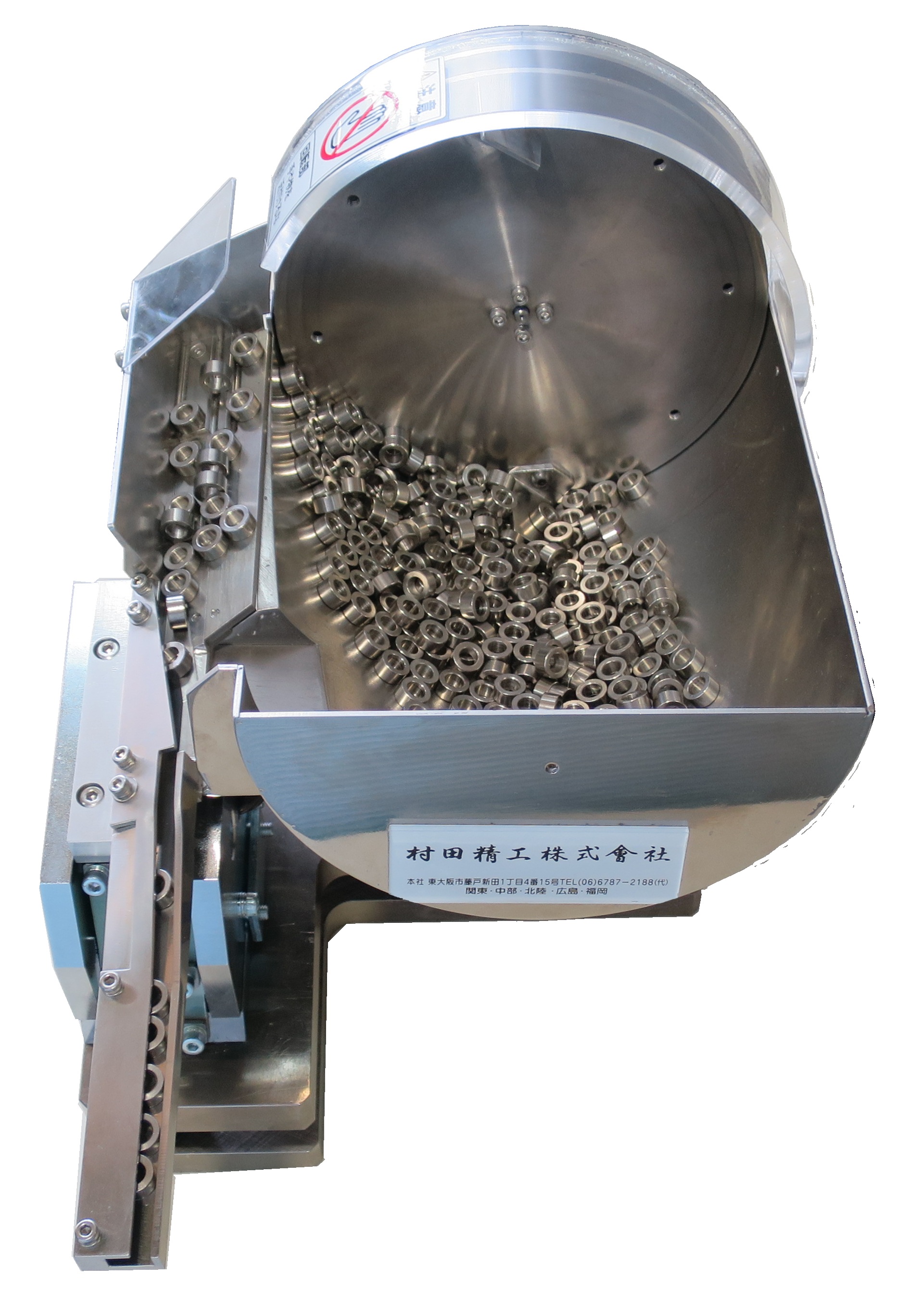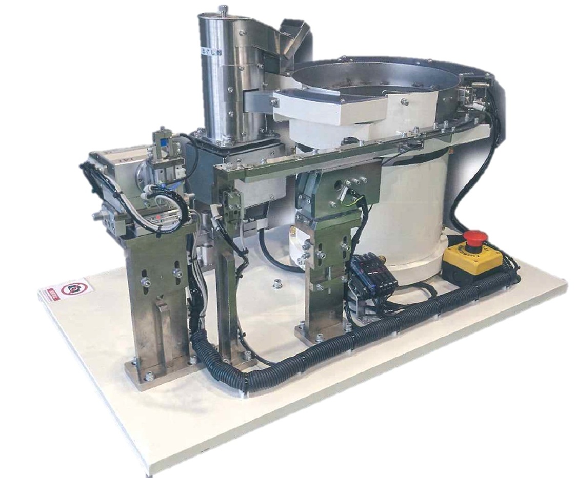 ボルト・Sワッシャ・平ワッシャの3点部品を1台のパーツフィーダで仮組し排出します。ワークの径違いを見るローラー選別機付きです。62年の高いツーリング技術力をご覧ください。