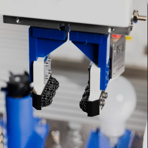 格子状(ラティス)の樹脂構造を持つロボット指。高い耐久性と柔軟性を備え、対象物の形状に合わせて変形。多品種・異形状の物を安定して包み込むように把持可能。